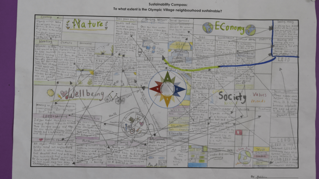 In preparation, we researched the neighborhood and discussed the types of sustainability features we might encounter. Students were also introduced to the sustainability compass, a tool that helps analyze sustainability through four lenses: nature, economy, society, and well-being.